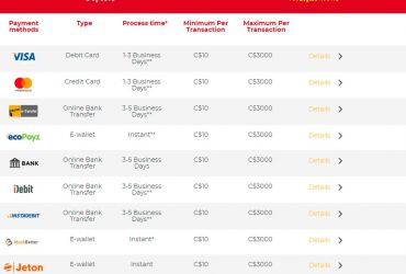 Un montant de dépôt minimum de 10 $ C $ est standard pour toutes les options de paiement. Si vous souhaitez remplir votre portefeuille avec de grandes quantités, considérez d'abord les limites de chaque méthode. Le dépôt maximum varie de 400 $ à 5 000 $ CA, avec PaySafecard offrant l'option la basse.