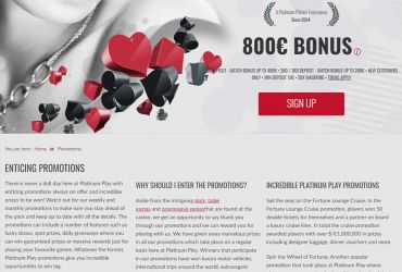 Platinum Play Casino n'offre pas beaucoup de bonus et de promotions pour ses joueurs ordinaires, mais il existe un forfait de bienvenue fantastique qui attend de nouveaux joueurs qui se joignent aujourd'hui. Sur vos trois premiers dépôts sur le site, vous pouvez hâte de vous accéder à 800 $ en argent bonus! Rappelez-vous simplement que vous devez effectuer un dépôt minimum de 10 $ pour être éligible à chaque bonus de dépôt et il existe 50x exigences de mise en place.