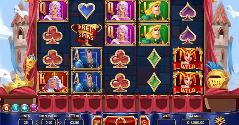 Les symboles utilisés dans cette fente sont des rois, des reines, un jester, un chevalier, un trophée, une poitrine et des symboles de carte classiques.
