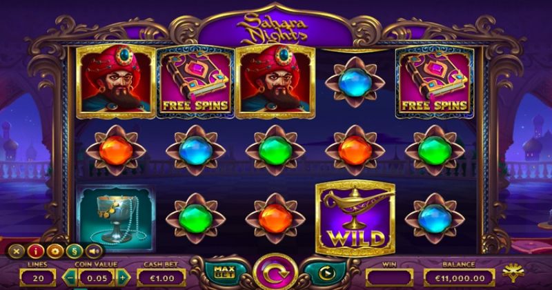 Yggdrasil est connu pour ses emplacements d'histoire magnifiquement conçus. Sahara Nights est la prise du fournisseur sur l'histoire populaire d'Aladdin. Le fond de la fente est l'intérieur du palais du sultan. Il a une palette de couleurs violet riche et des gemmes contrastées brillantes sur les bobines elles-mêmes.